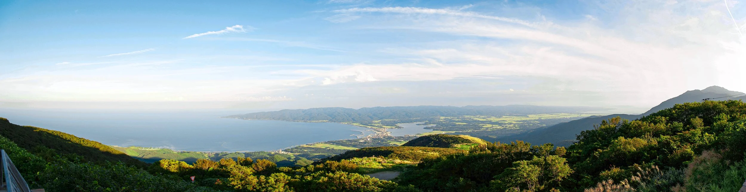 Views from Mount Donden. Visible below is Lake Kamo, with Ryotsu town on its left